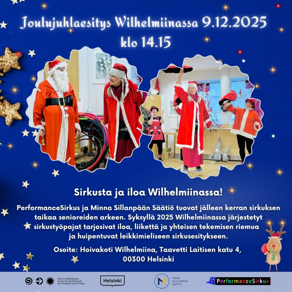 Slide HeadingPerformanceSirkus jatkaa 4.9.2025 lähtien senioreille suunnattuja sirkustyöpajoja! Napsauta tästä lukeaksesi lisää.Slide HeadingPerformanceSirkuksen Lapinlahden Lähteen kirjoitustyöpajojen syyskausi 2025 alkaa Valo-tilassa maanantaina 15.9.2025 klo 14.30. Napsauta tästä lukeaksesi lisää.PerformanceSirkus jatkaa 4.9.2025 lähtien senioreille suunnattuja sirkustyöpajoja! Napsauta tästä lukeaksesi lisää. Joulujuhlaesitys hoivakoti Wilhelmiinassa 9.12.2025 klo 14.15 Katso lisää Koulusirkus-esitys 12.11.2025 klo 13:30 Myllypuron palvelukeskuksessa Katso lisää Teatteriesitys “Kettu kuningattarena” Kotisatamassa Katso lisää