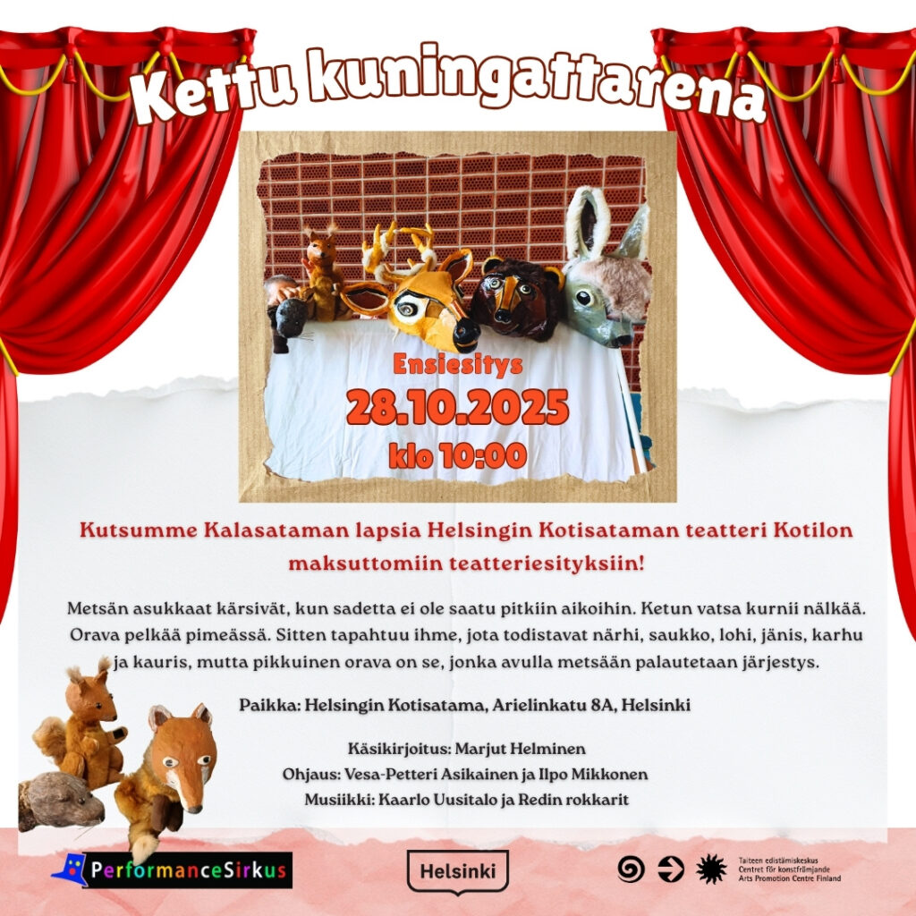 Nukketeatteriesitys on osa Kotisataman ja PerformanceSirkuksen ylisukupolvista kulttuuritoimintaa, jossa lapset ja aikuiset osallistuvat taiteen tekemiseen ja kokemiseen yhdessä.